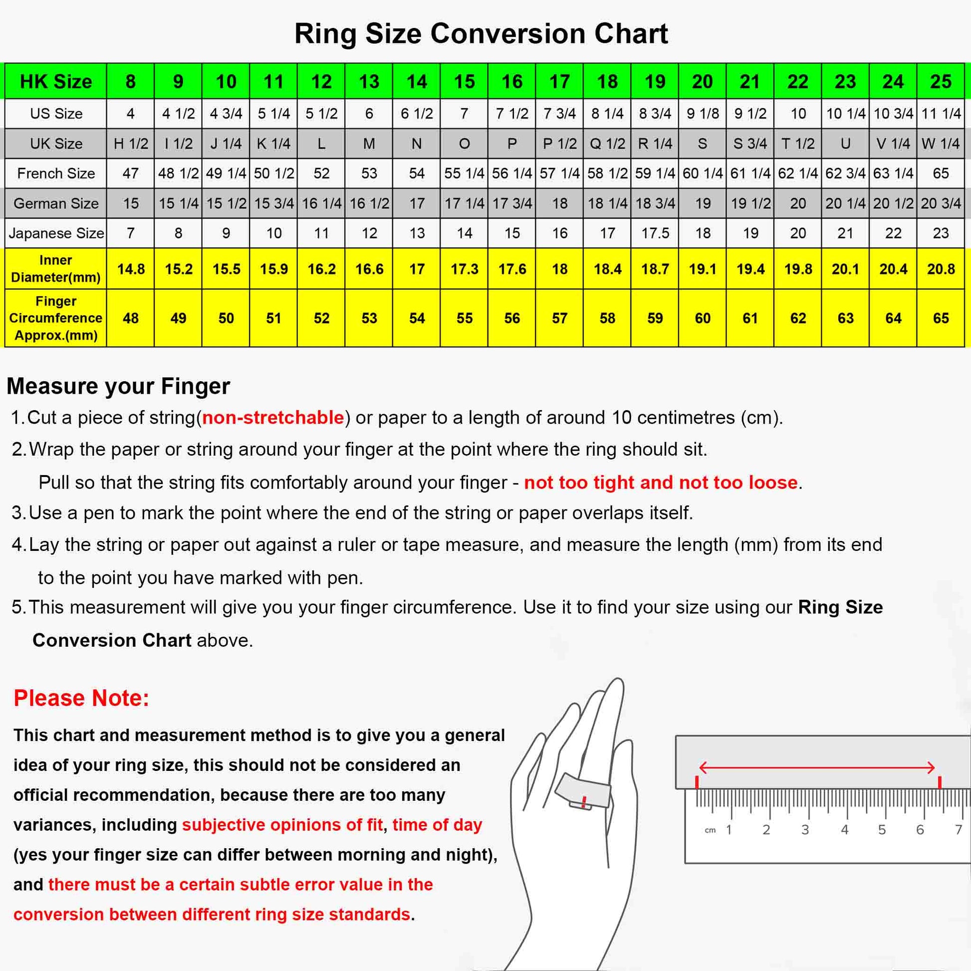 Please Note: the ring size is HK standard, NOT US SIZE, please refer to the Size Conversion Chart (as the picture shown) to choose the appropriate size, if there is any questions, or you need other sizes, please feel free to contact me, we'll do our best.